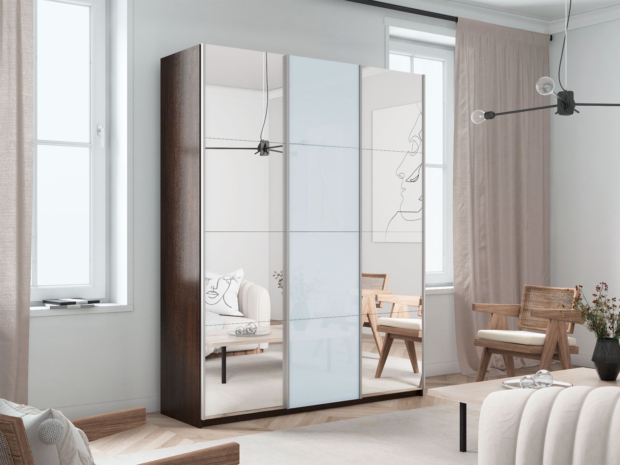 - Шкаф-купе Прайм 3-х дверный 1800 Зеркало/Стекло Белое/Зеркало Венге