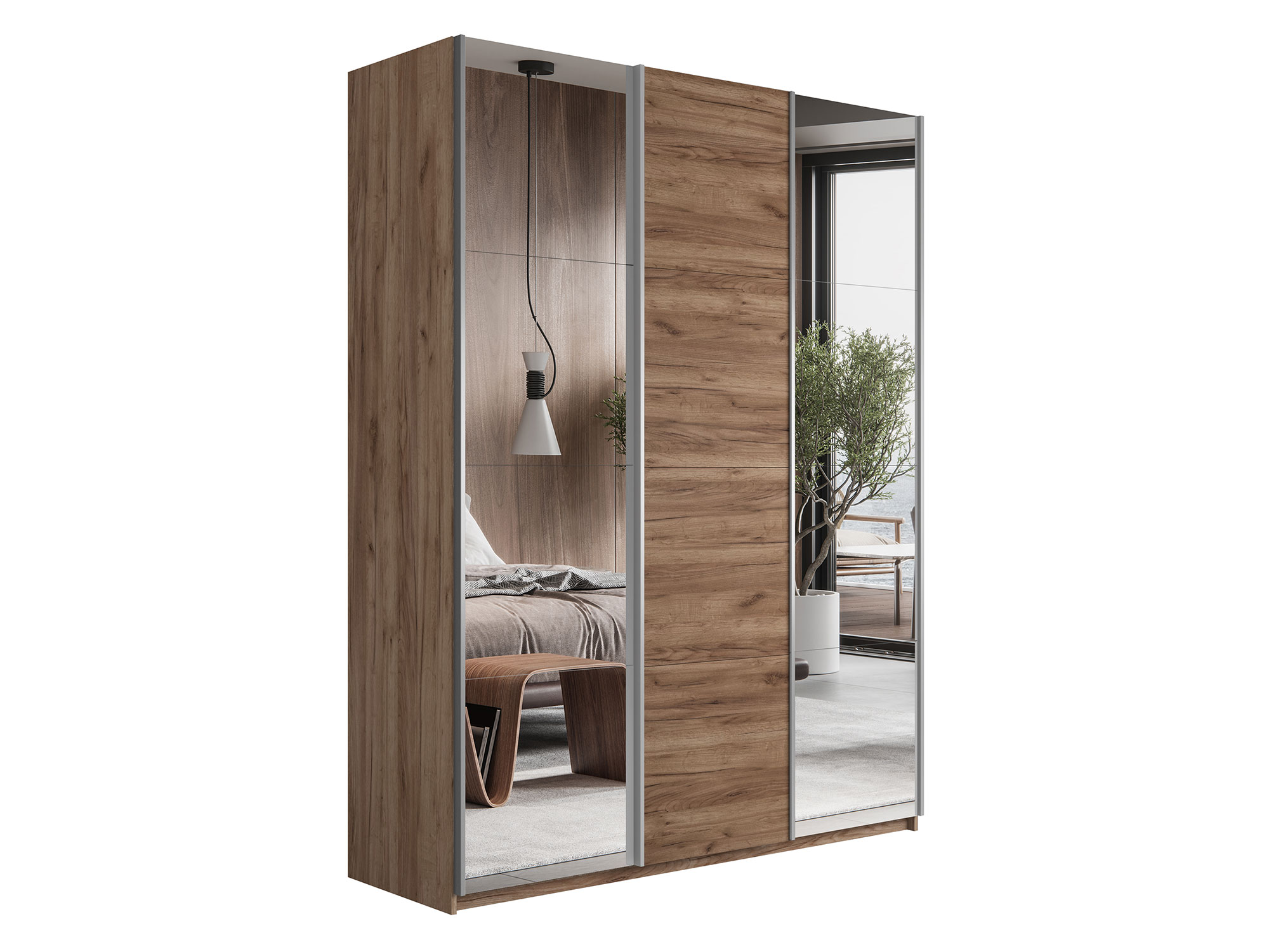 - Шкаф-купе Прайм 3-х дверный 2100 два Зеркала/ДСП Крафт табачный