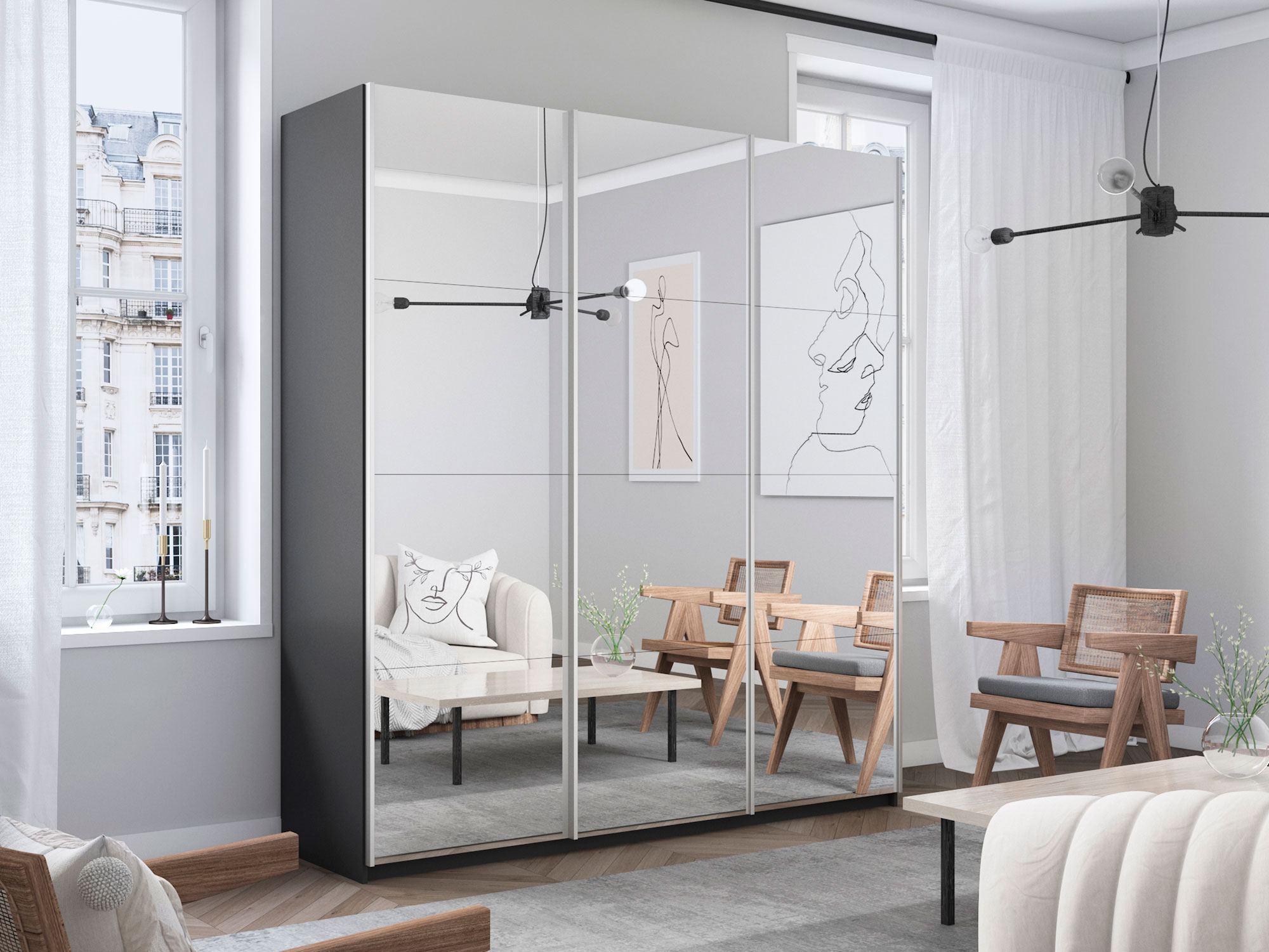 - Шкаф-купе Прайм 3-х дверный 2100 три зеркала Серый Диамант