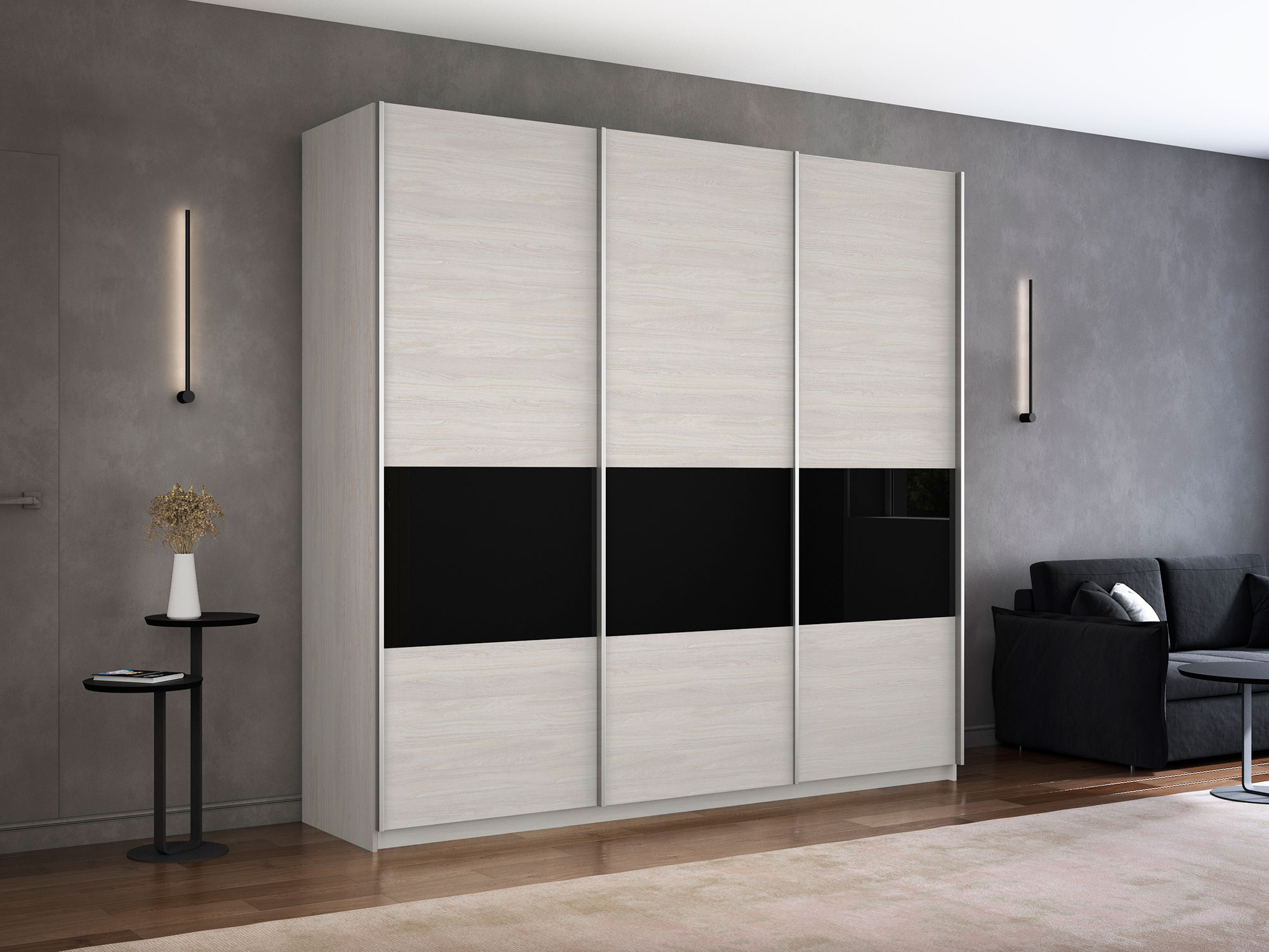Шкаф-купе Прайм Широкий 3-х дверный ДСП/вставки Стекло Черное Ясень Анкор Светлый